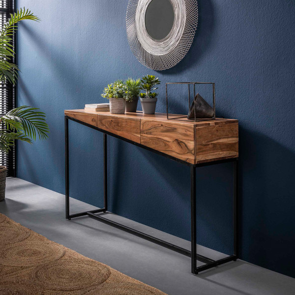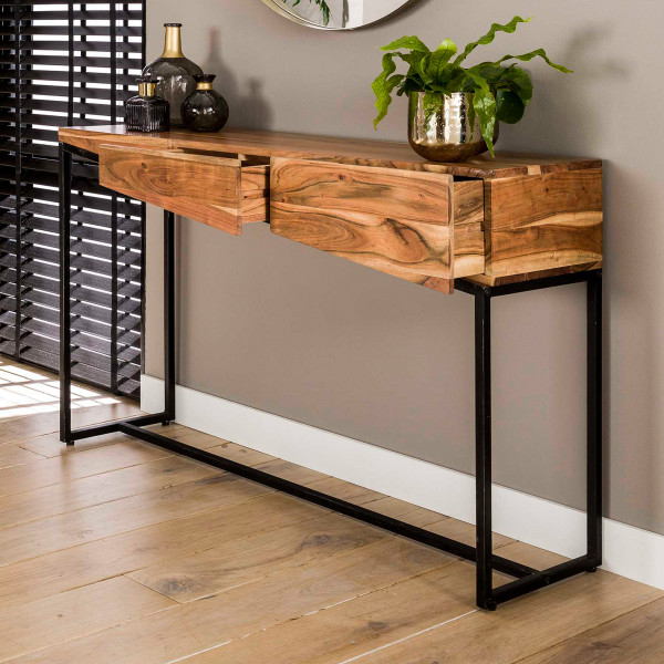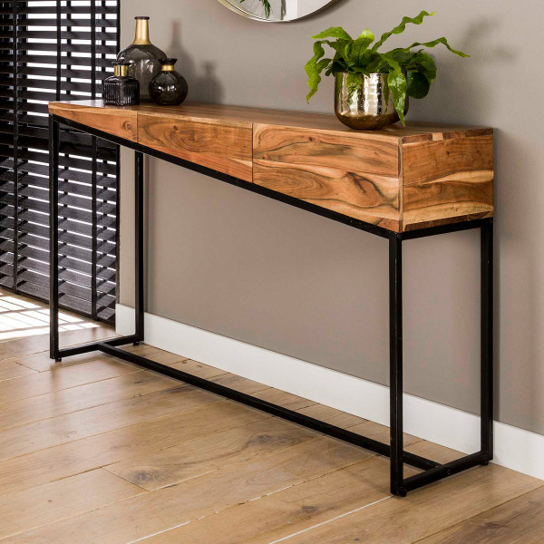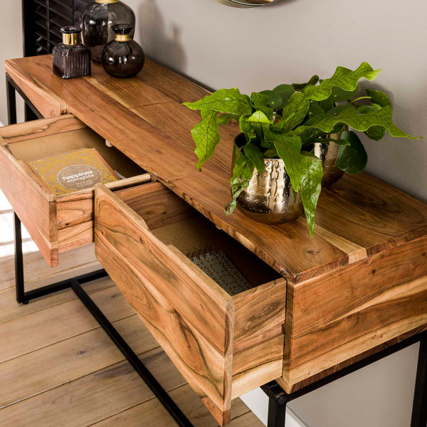 Deze sidetable van acaciahout brengt bijzonder veel sfeer naar je woonruimte. In het acaciahout zijn de karakteristieke lijnen van de natuur nog mooi terug te zien! Tegelijkertijd zorgt het schuine design voor een moderne uitstraling. Je kunt de sidetable in de hal gebruiken voor handschoenen, post en sleutels: in de drie lades is ruim plaats. Of maak er een kaptafel van!